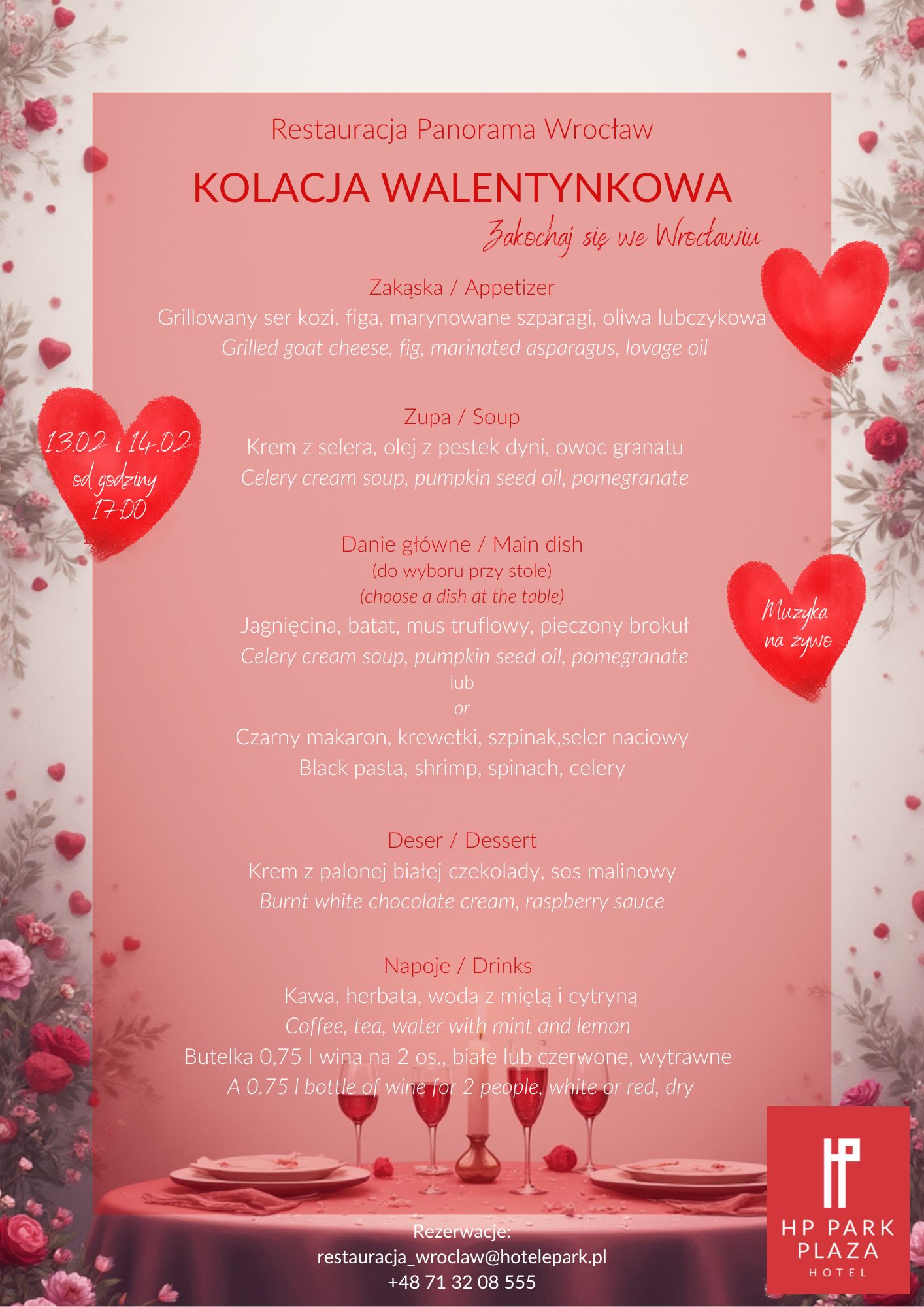 Specjalnie na tą okazję przygotowaliśmy dla Was romantyczny pobyt w intymnej atmosferze i przy nastrojowej muzyce na żywo.